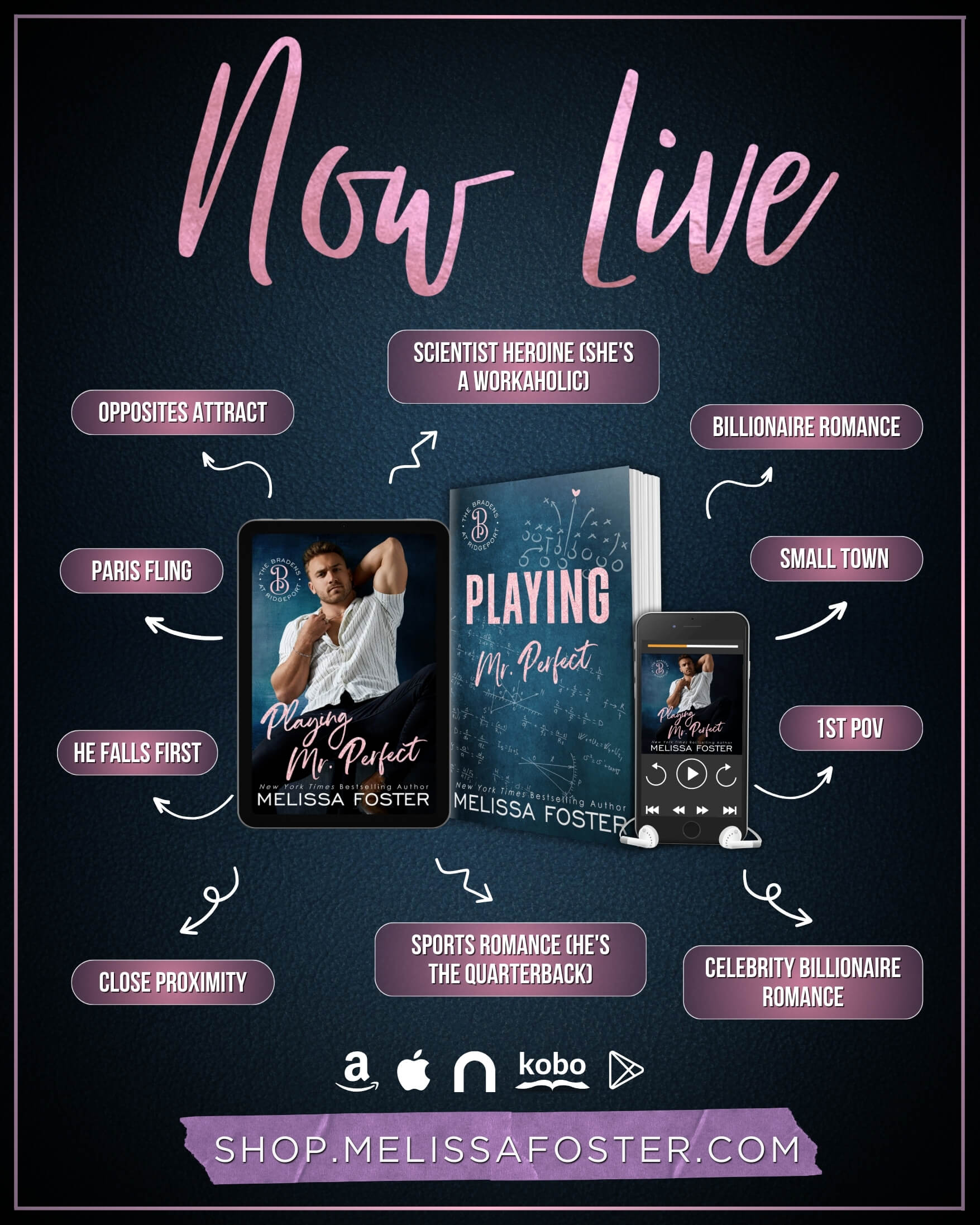 Quarterback Clay “Mr. Perfect” Braden is determined to show sexy scientist Pepper Montgomery the benefits of hands-on research in PLAYING MR. PERFECT, the first book in the Bradens at Ridgeport series. Loaded with heat, humor, and heart, this steamy, small-town, opposites-attract standalone romance is unputdownable. No cheating, no cliffhangers, and a happily ever after that will leave you breathless.