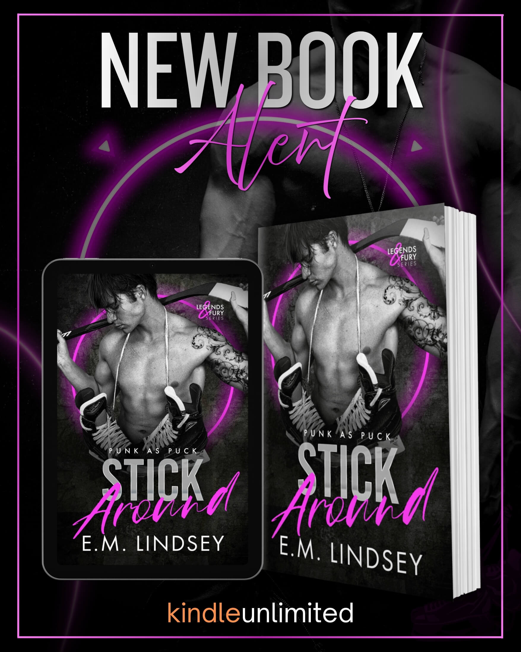 Stick Around is the first book in the Punk as Puck spin-off series, Legends and Fury. It’s a high heat, enemies to lovers rom-com with a snarky NHL goalie who has a lot of big opinions and doesn’t care if they’re unsolicited, a PPHL goalie with a mountain of problems and no way to reach the top, locker room hookups, praise, swoony romance, a low-stakes bi-awakening, hockey bro banter, tons of chirping, and the swooniest happily ever after.