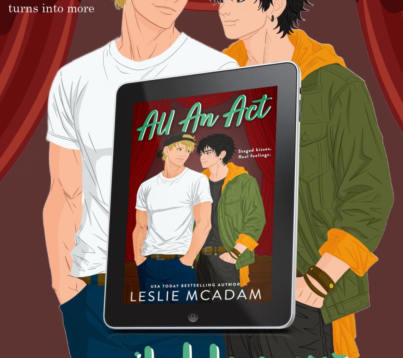 Except Lachlan didn’t know when he accepted the lead role that he’d have to kiss a guy—me—in front of the entire audience. And he didn’t know that I’ve had a crush on him forever. Although he might be suspicious, given what we get up to when no one else is around.